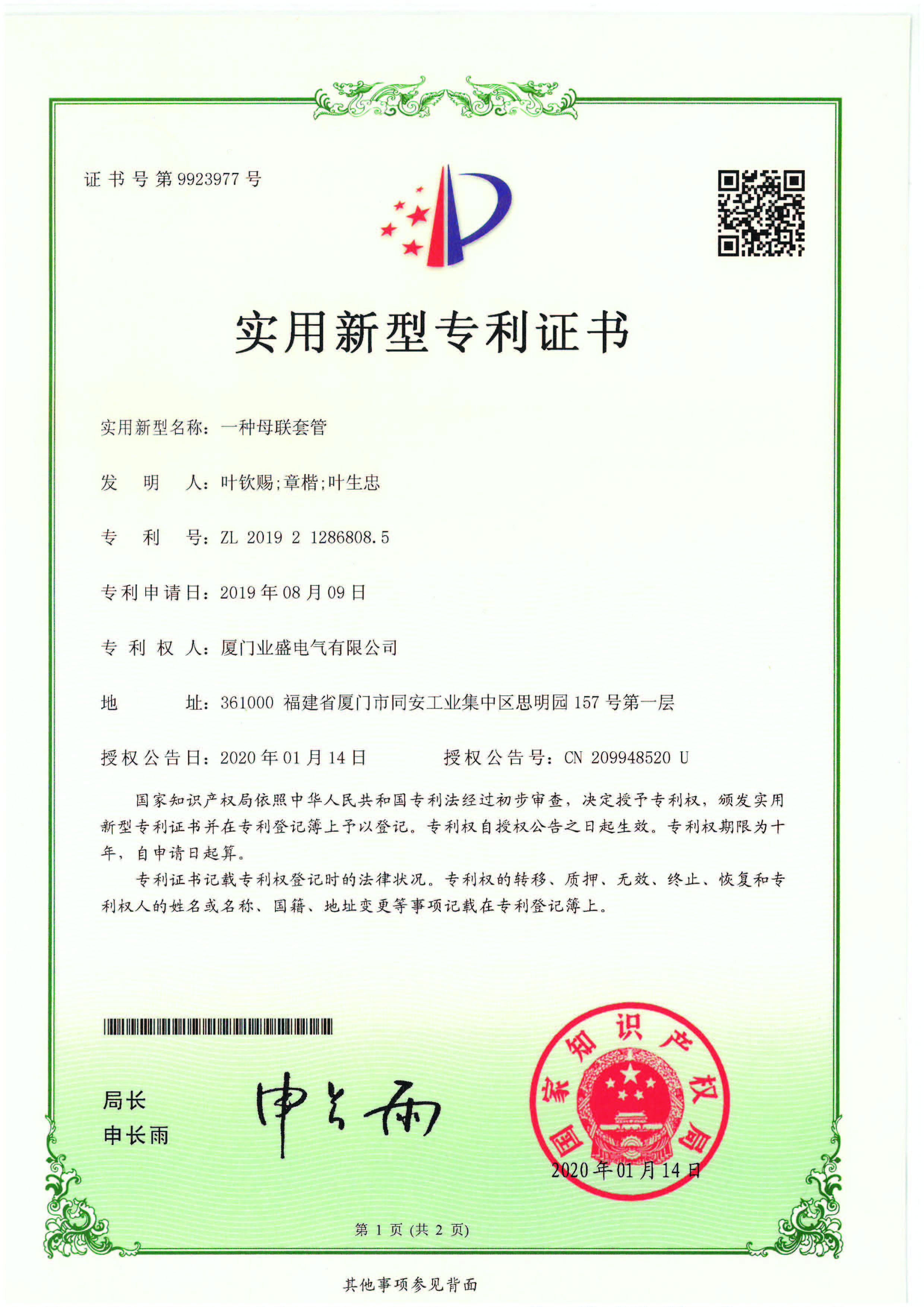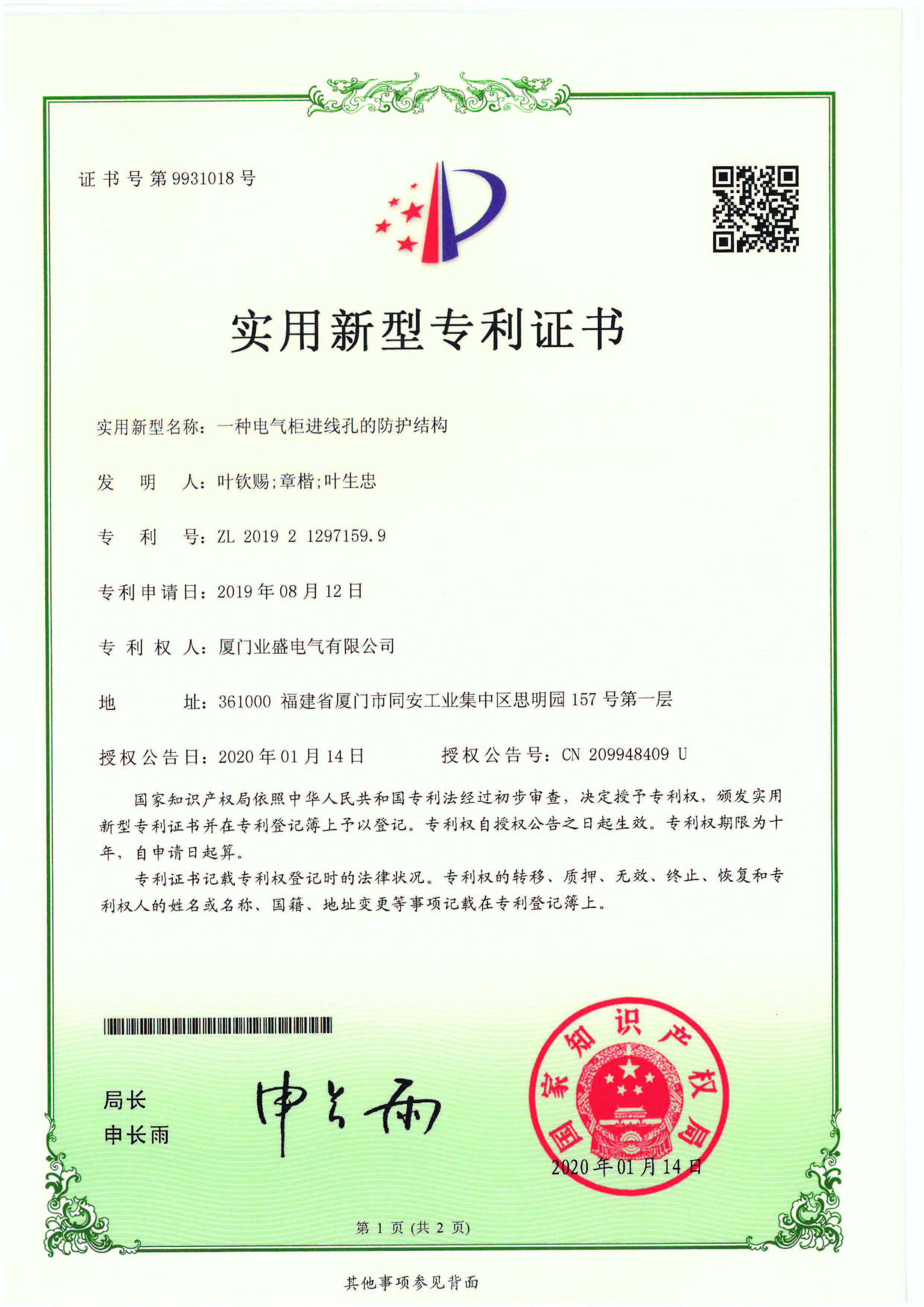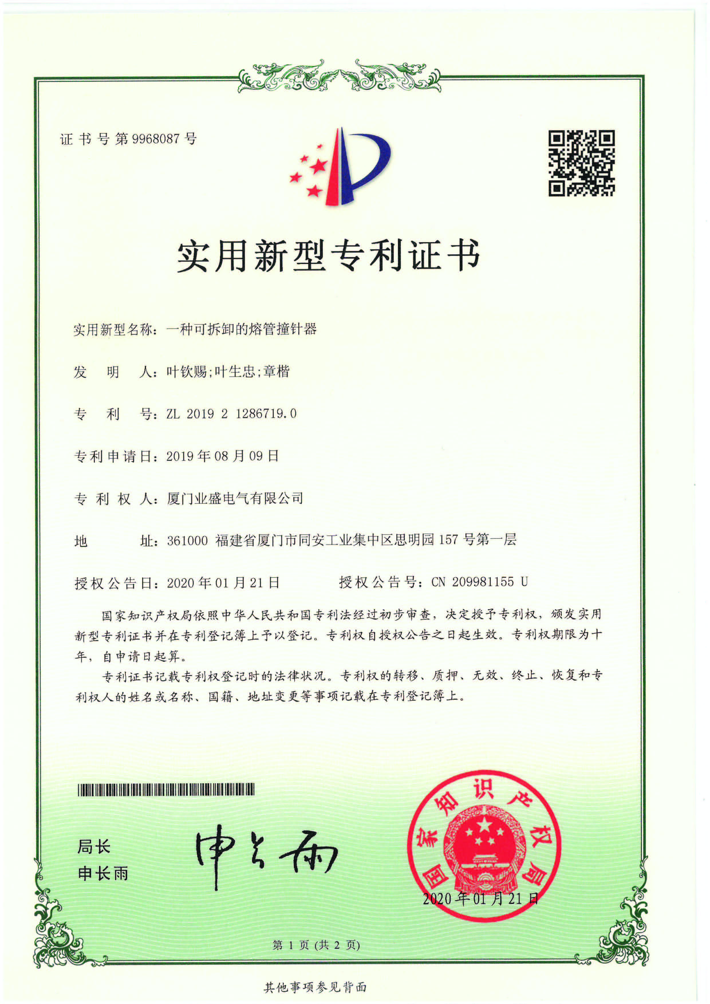 實(shí)用新型專利證書(shū)